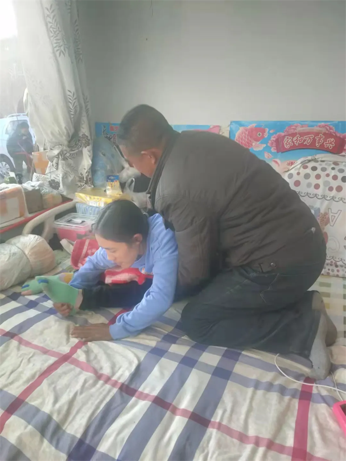 妻子瘫痪以前,王刚家庭条件并不富裕,但一家人其乐融融,妻子在家操持家务,自己在外打工贴补家用,两个女儿活泼可爱,夫妻互敬互爱,未来生活充满着希望。2017年的一场突如其来的车祸,把这一切残忍地破坏了,高位截瘫、卧床不起,生活不能自理。接连的噩耗,让王刚一下就懵了,他意识到妻子的下半辈子可能就要在床上度过了,看着两个未成年的孩子,再看看卧床不起的妻子,王刚感觉天塌了。“一定要把妻子照顾好,孩子们不能没有这个妈!”这个信念激励着王刚一个人担起了生活的重担。从此王刚开始了举步维艰的生活,天蒙蒙亮就得起来做饭,照顾妻子起居,吃完饭再送孩子们去上学,接着马不停蹄的去打工,每天周而复始,像一个陀螺一样连轴转,终日忙得脚打后脑勺,没有一点喘息的机会。