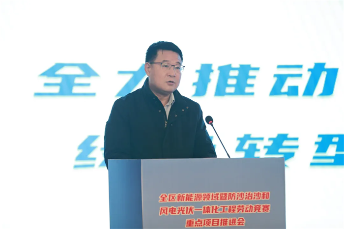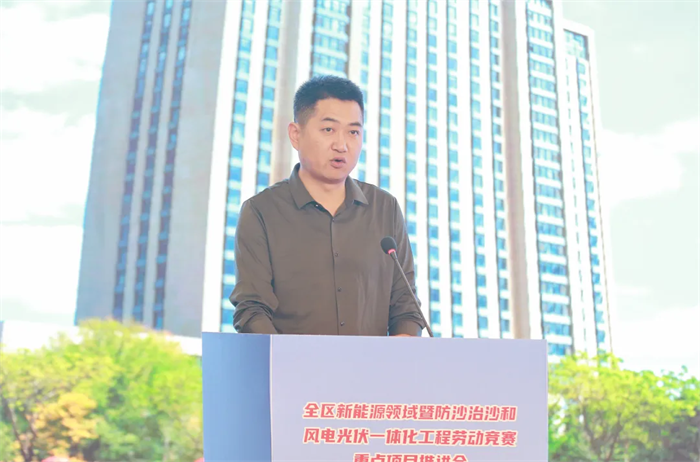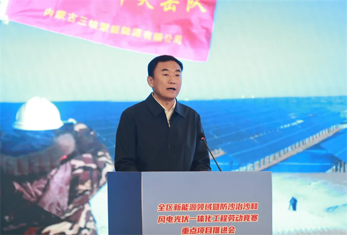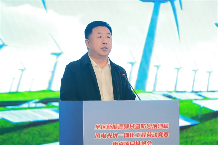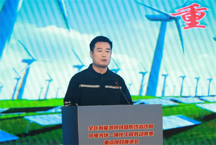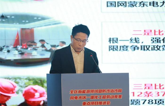 会议展播了全区新能源领域暨防沙治沙和风电光伏一体化工程劳动竞赛重点项目视频,内蒙古能源集团乌兰布和沙漠东北部新能源基地先导100万千瓦项目等4家引领性建设项目负责人及内蒙古电力集团工会等3家竞赛组织单位负责人作交流发言,大唐蒙东新能源事业部绿电项目职工代表作表态发言,观摩了劳动竞赛重点项目展板展示。