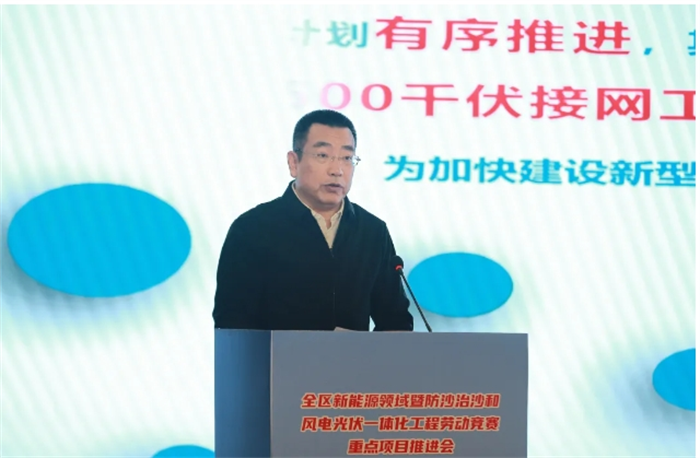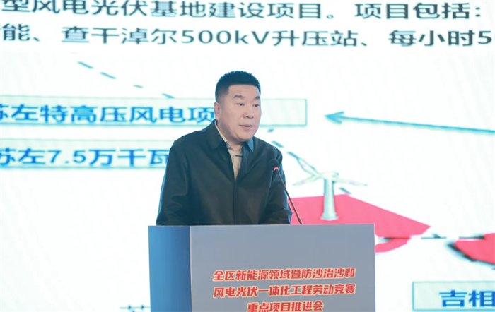11月12日,全区新能源领域暨防沙治沙和风电光伏一体化工程劳动竞赛重点项目推进会在呼和浩特召开。自治区总工会党组书记、副主席张慧宇讲话,自治区总工会党组成员、副主席邬兴宇主持会议。