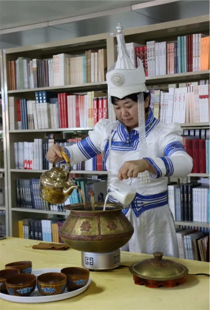 学成归来,反哺教育。李晓霞将所学再次搬上课堂,先后开设并录制《饮品制作》、《茶艺与茶文化》等精品课程,参与编写国家职业技能等级认定培训教材《茶事服务》、《茶艺师(技师与高级技师)》和《茶艺师(高级)》。理论与实践的完美结合,让她的课堂倍受同学们喜爱。课堂革命从传统教室走入图书馆和文化广场,伴着书香,迎着清风,同学们一边观摩老师娴熟的蒙古奶茶制作工艺,一边品味感悟茶的融合性和包容性。奶茶的养分,滋润着每一个蒙古族儿女的身心,奶茶的醇厚,把蒙汉两个民族融合成了一家人。茶是生命与生命的融合,茶将中国人的命运更紧密地连接在一起。