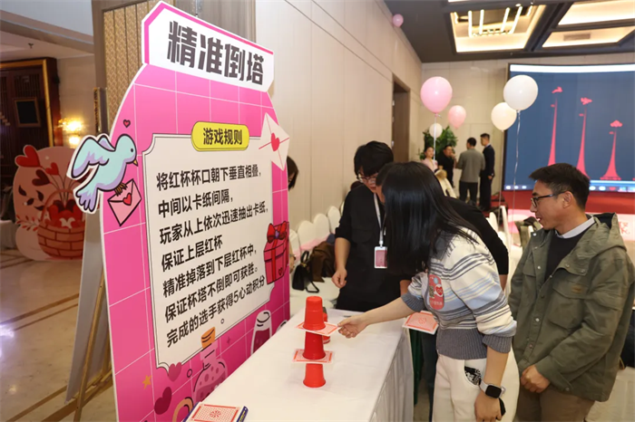 来自自治区直属机关驻呼市的300余名单身青年职工相聚在内蒙古职工之家酒店,共同开启一场浪漫的甜蜜之旅。在联谊活动开始之前,为了让当代青年树立正确的恋爱观和婚姻观,还邀请到了自治区总工会职工婚恋交友服务工作室顾问张伟老师为大家现场作了精彩分享。活动现场的气氛在主持人带领下,迅速升温,并通过“缘分大风吹”、“缘来有默契”等游戏环节,让现场青年男女迅速“破冰”。随后,大家在“相亲游园”环节通过“甜蜜射击”、“比翼双飞”、“心跳高塔”等游戏中默契配合,每一个环节中都充满欢声笑语。大家在游戏中拉近距离,在交流中碰撞思想,在欢笑中收获友谊,活动现场处处散发着令人心动的气息,初始的拘谨逐渐融化,心灵的距离悄然拉近,缘分在甜蜜的氛围中悄然而生。活动最后,男女嘉宾们纷纷上台,介绍自身性格特点、兴趣爱好,并说出自己的理想型伴侣。整场游戏积分前三名的小组还获得了精美的伴手礼。