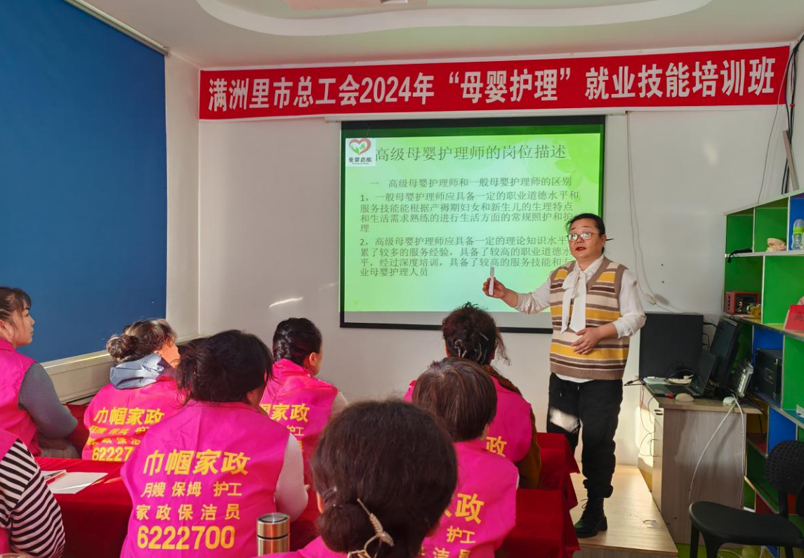今年以来,满洲里市总工会强化就业优先政策,进一步完善重点群体就业服务体系,积极缓解就业压力,促进高质量充分就业。满洲里市总工会根据当下社会发展趋势以及母婴护理行业就业需求量大、专业型人才较少等情况,开展母婴护理培训班,打造一站式“就业+培训+服务”就业服务平台,联合多家用人单位为取得结业证书的合格学员提供工作岗位和就业机会,确保合格学员上岗率达到80%,进一步激发就业新活力,营造公平就业环境。