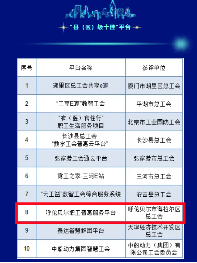 此次评选活动,从综合普惠服务能力、工会特色服务、普惠服务效果、普惠服务保障、年度附加项五个方面,对平台的建设情况和使用成效进行全面评估,经过层层评比,荣膺全国排名第8!