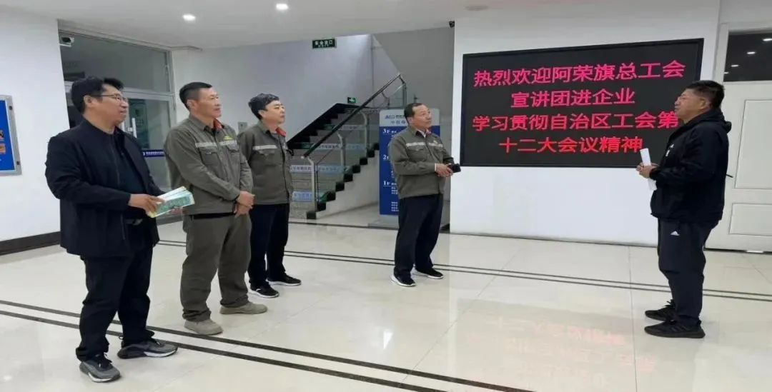 旗总工会负责人传达学习内蒙古自治区工会第十二次代表大会会议精神,并与企业负责人、创新工作室负责人亲切交流,详细询问企业的生产经营、科技创新、人才培养、职工权益保障等方面情况,并就安全生产工作提出建议。