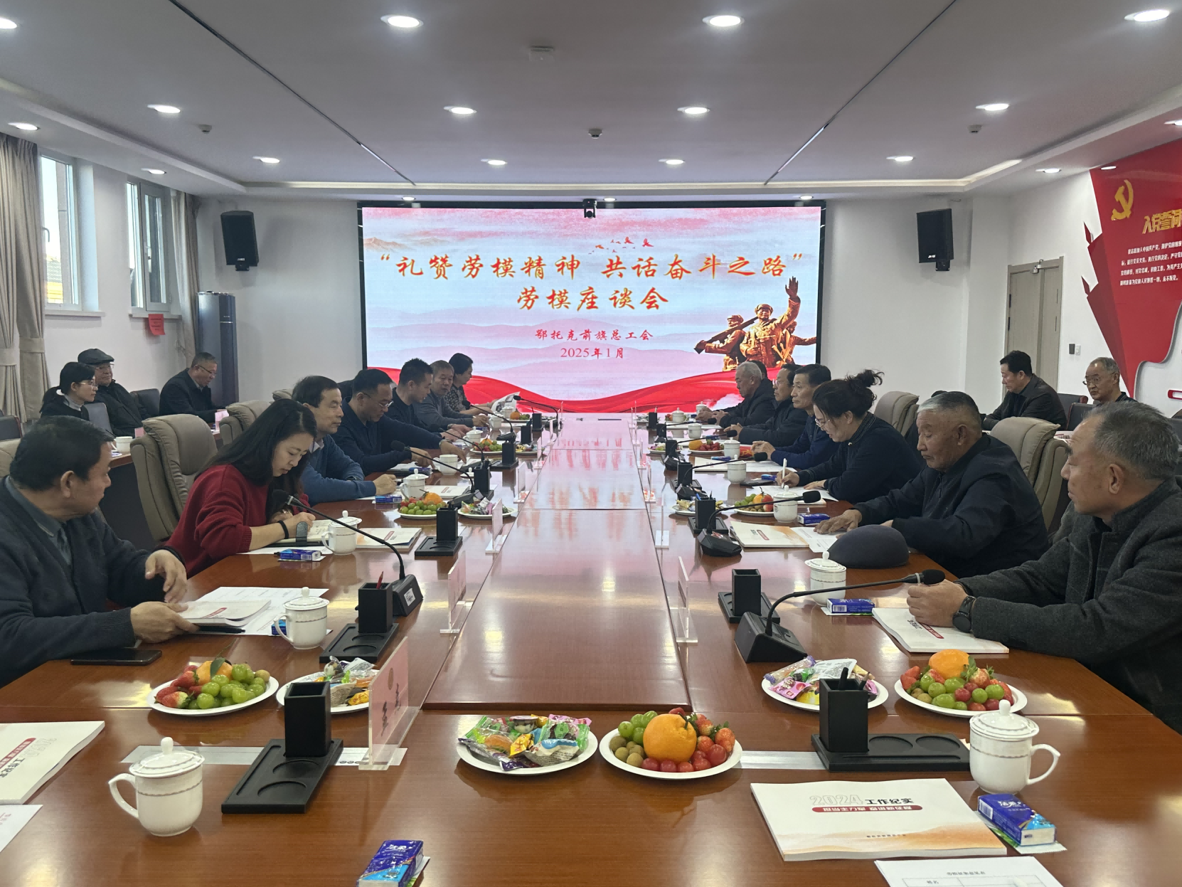 座谈会上,旗总工会对2024年工作开展情况和2025年工作计划作了简要汇报,集中观看了2024年工作专题片,重点就劳模服务管理工作展开座谈。