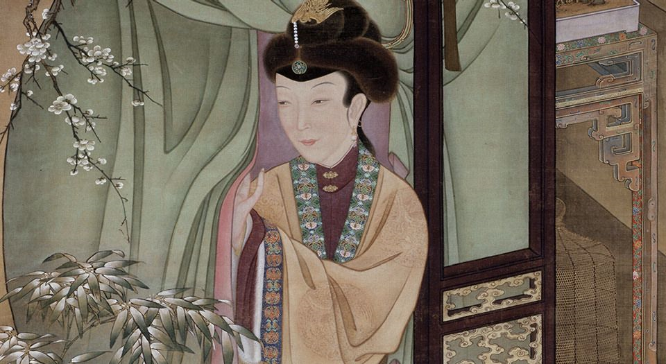 《雍正十二美人图》中,头戴“卧兔儿”烘炉观雪的美人。(图片来源:书格网)