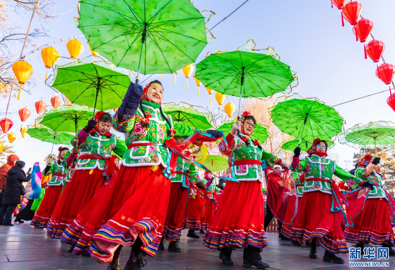 2025年2月3日,民间艺人在呼和浩特新春文化庙会上表演秧歌。新华网发(丁根厚 摄)