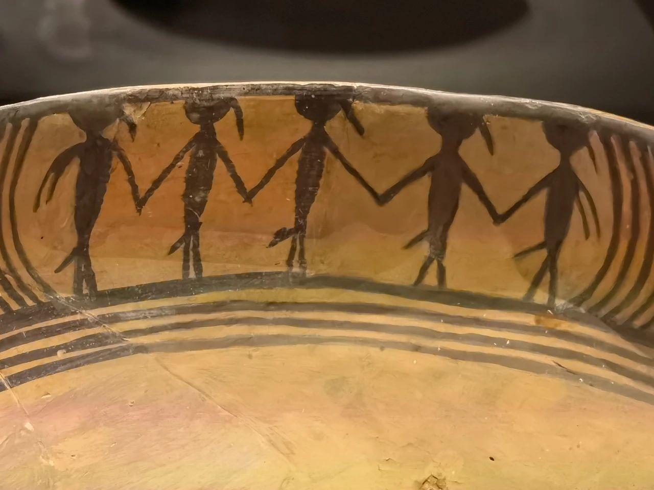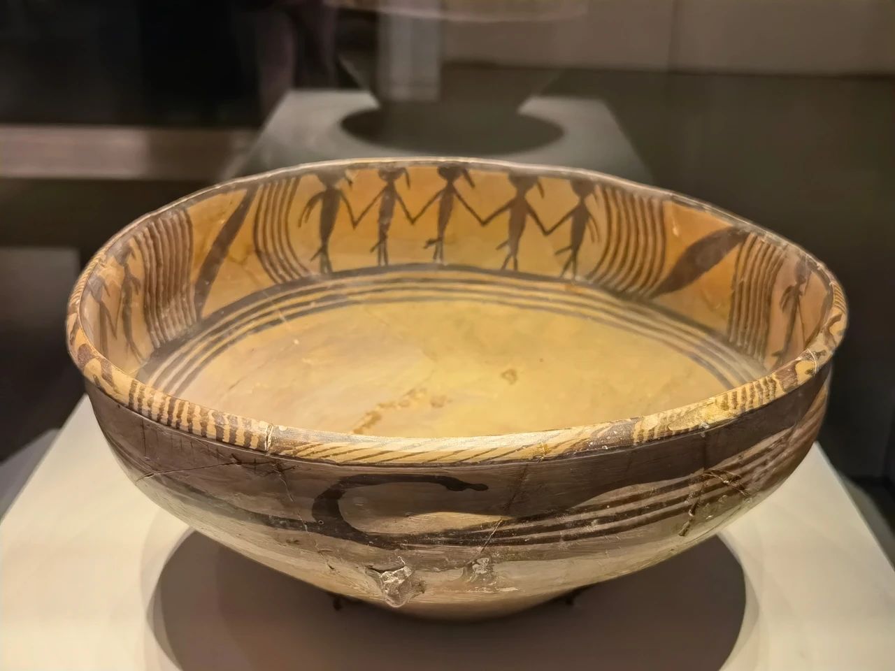 马家窑文化典型器物——舞蹈纹彩陶盆,真实生动地展现了先民们在重大活动时群舞的热烈场面。作者供图