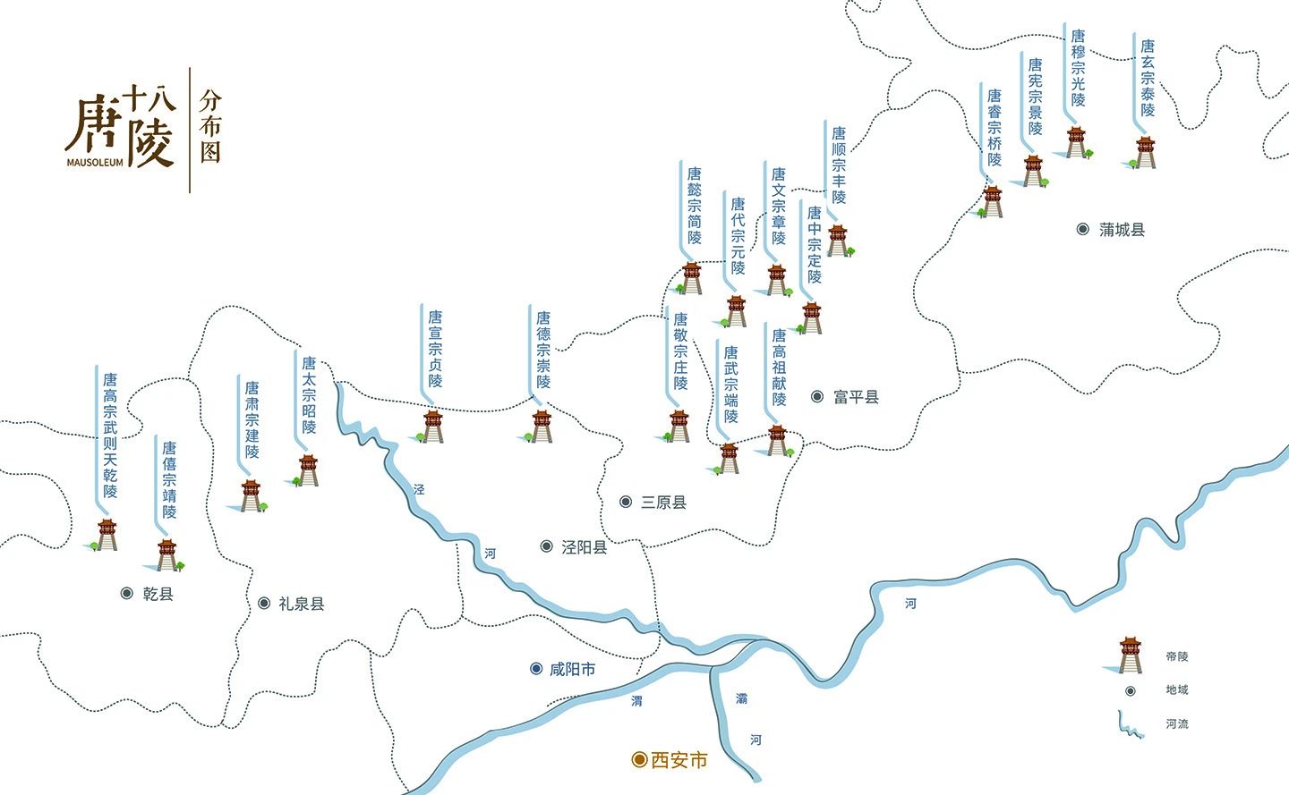 关中十八陵,全称“关中十八唐帝陵”,指的是除昭宗和哀帝两位末代皇帝外,位于关中地区渭水北岸富平、蒲城、三原、泾阳、礼泉和乾县六县的包含武则天在内的十九位唐朝皇帝的陵寝。