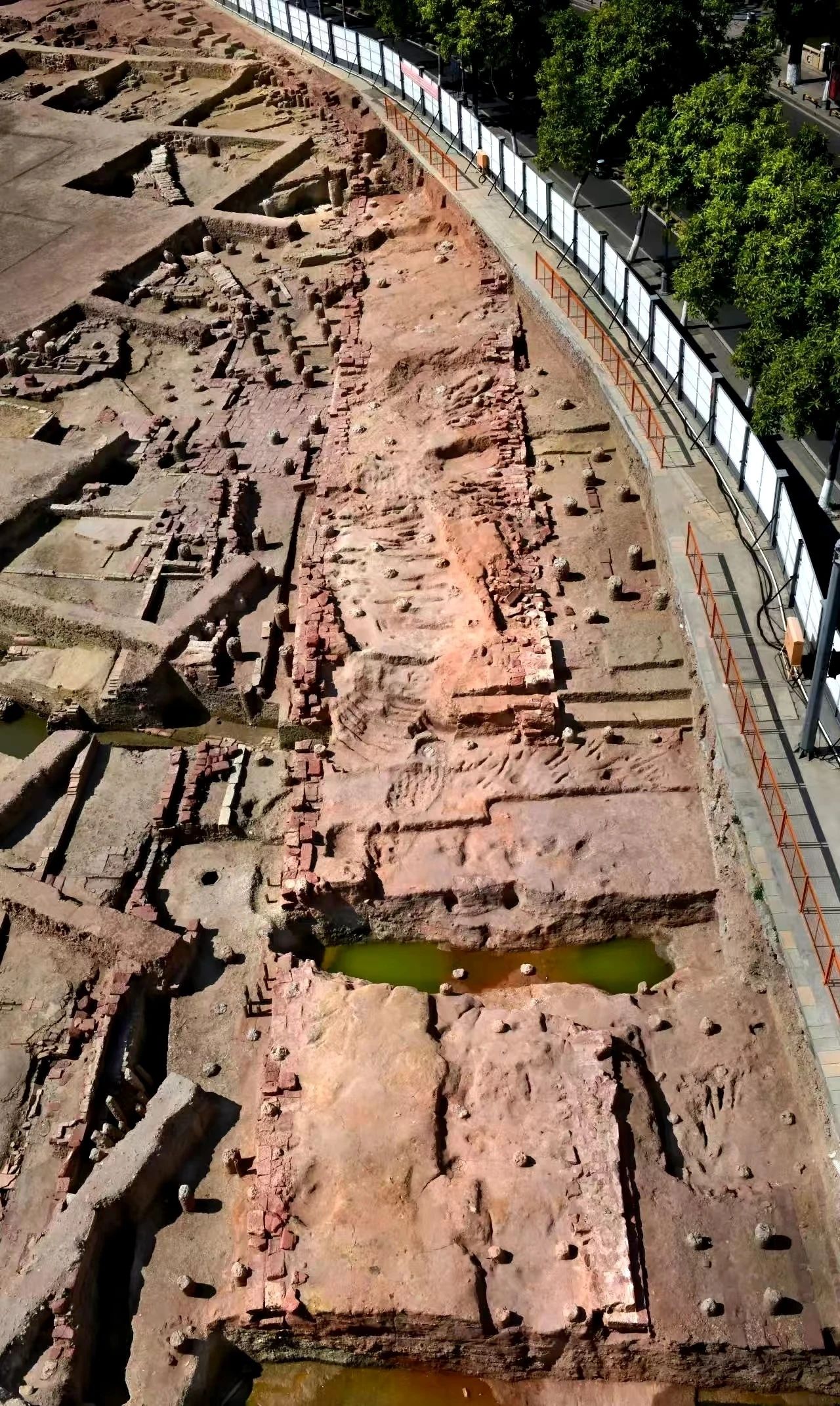 明代南海卫城墙内三级排水系统俯瞰。(图片来源:广东发布)
