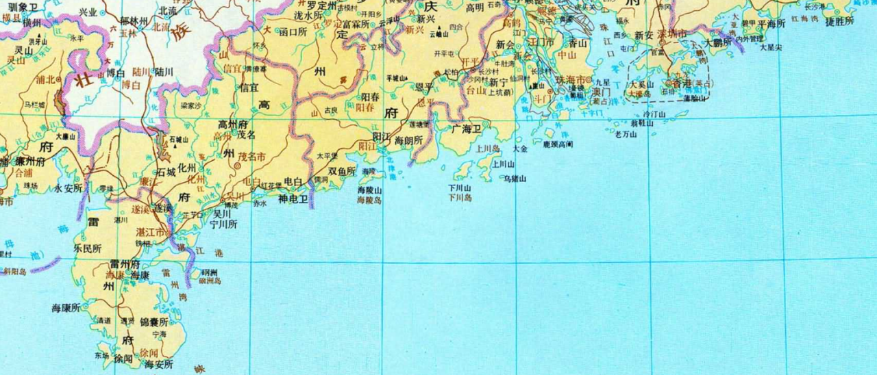 明朝时期的广东南部地区,沿海地带可见卫所遍布。(图片来源:谭其骧《中国历史地图集》)