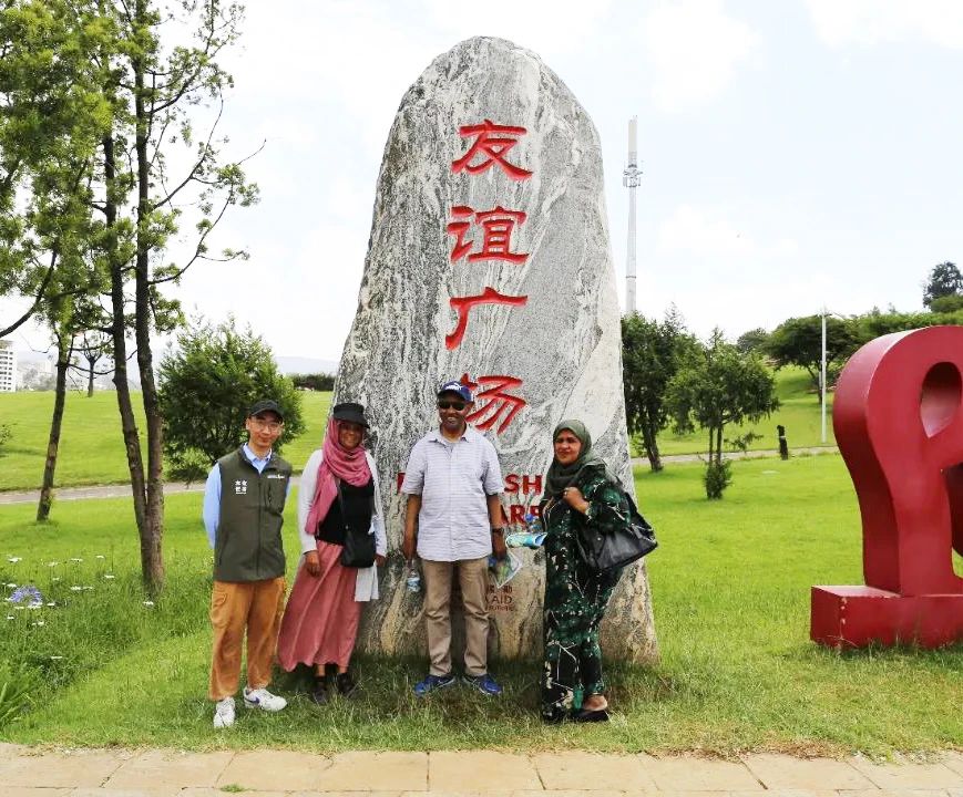在埃塞俄比亚首都亚的斯亚贝巴,中国援建的友谊广场将昔日荒地改造成生态绿地,成为深受当地居民喜爱的新地标。图为埃塞俄比亚中资企业志愿者与当地居民在纪念碑前拍照留念。(图片来源:中国乡村发展基金会微信公众号)