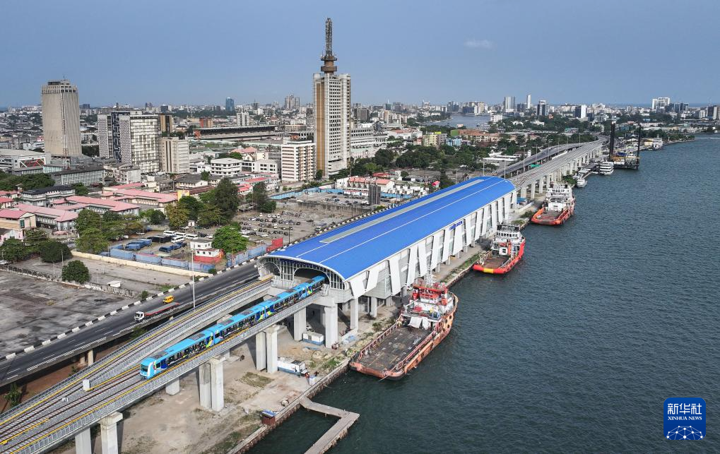 3月2日,在尼日利亚拉各斯,一列轻轨蓝线列车驶入码头站(无人机照片)。(图片来源:新华社)