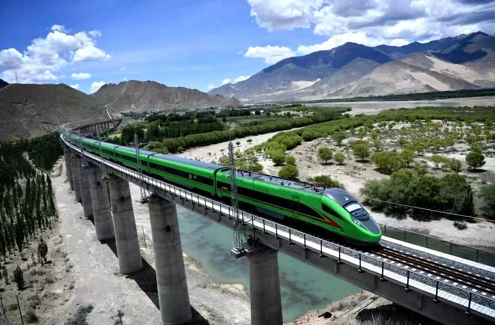 行驶在西藏山南市境内的复兴号列车。(图片来源:新华社)