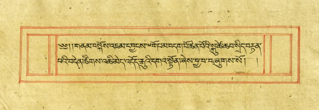 ▲《皇图永固经》封面。梵夹装,页面22.3厘米*7.2厘米,墨框17.6厘米*5.2厘米,朱色双栏,左侧框内写有藏文页码,页5行,共7叶。故宫博物院藏。