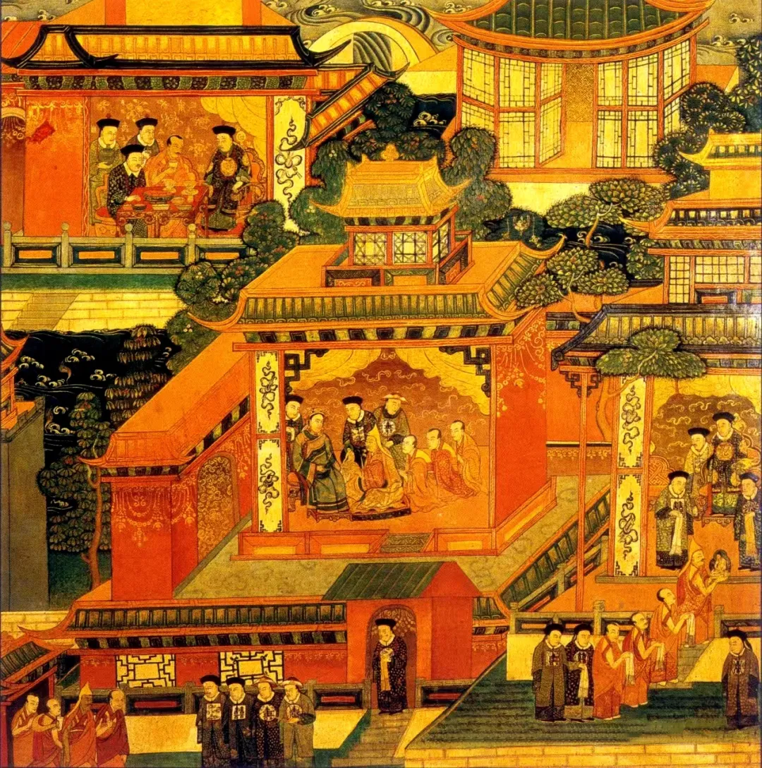 ▲十三世达赖喇嘛觐见慈禧太后和光绪皇帝壁画。(图片来源:中国西藏文化保护与发展协会)