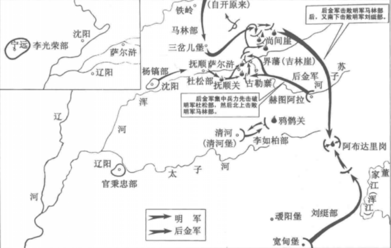 ▲萨尔浒之战作战示意图。(图片来源:《清代辽宁全史:军事卷》)
