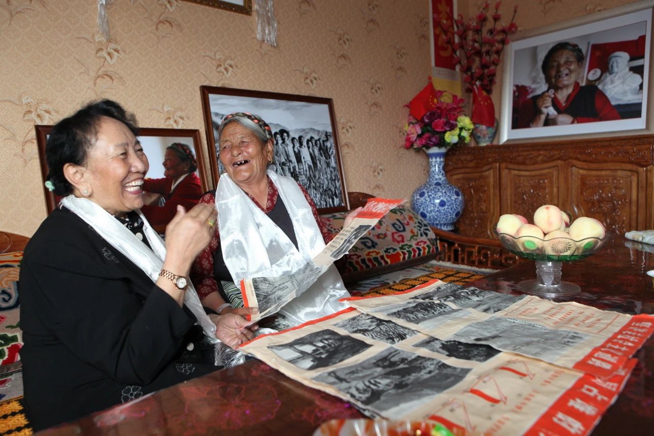 ▲才旦卓玛(左)拜访次仁拉姆(右二),两人重温青年时期到北京参加人民代表大会时的情景。车刚 2012年 摄于次仁拉姆家中