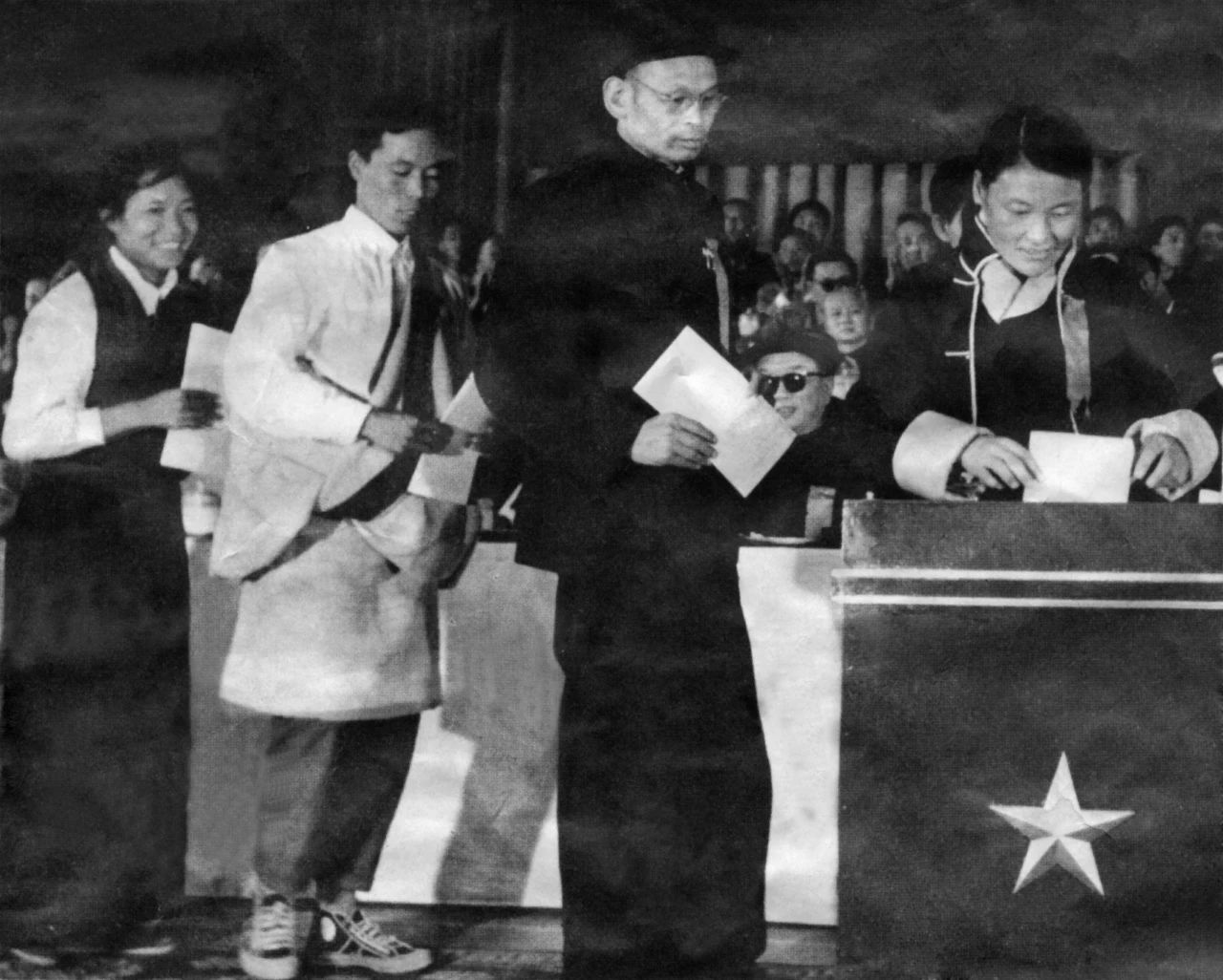 ▲1965年9月8日,西藏自治区第一届人民代表大会第一次会议选举了西藏自治区主席、副主席和自治区人民委员会委员。次仁拉姆(右一)作为代表正在投票。(新华社资料照片)