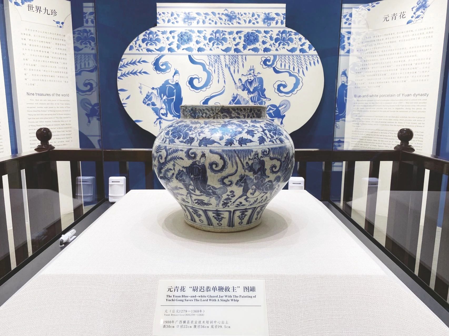 ▲元青花“尉迟恭单鞭救主”图罐,1980年出土于广西横县(今横州市),反映了元代广西地区与中原地区在文化上的交融。(图片来源:广西南宁市人民政府门户网站)
