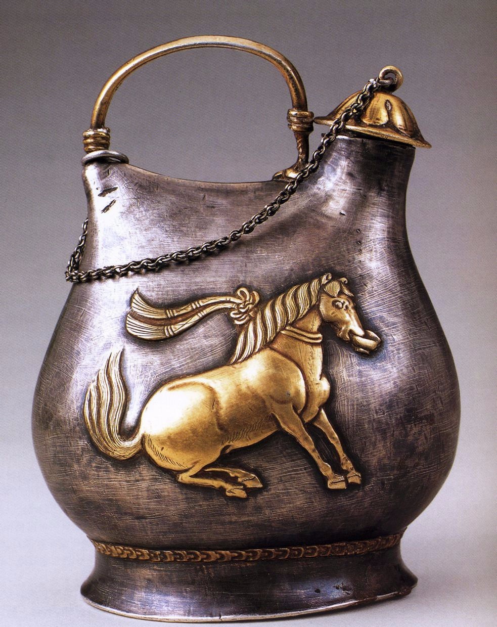 ▲唐鎏金舞马衔杯纹银壶,陕西历史博物馆藏。