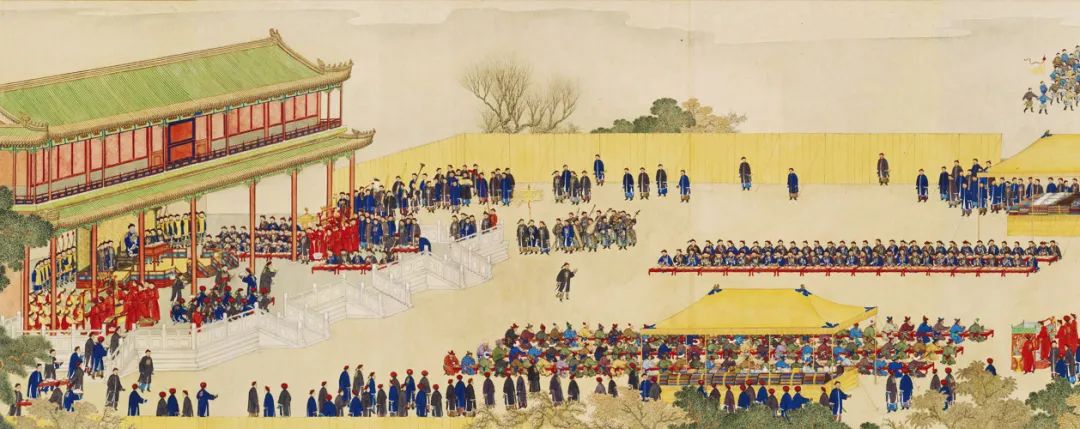 ▲《紫光阁赐宴图》卷,清,姚文瀚绘。乾隆二十五年(1760年),紫光阁修缮完成,乾隆皇帝下旨将平定准部、回部的100名功臣画像张悬于四壁。次年正月,乾隆皇帝又在此设庆功宴,王公贵族、文武大臣以及西征将士百余人出席。此画描绘了当时宴庆的宏大场面。(图片来源:故宫博物院)