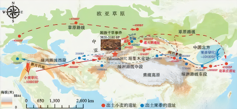 ▲小麦东传草原及绿洲通道示意图。(图片来源:百家杂评公众号)