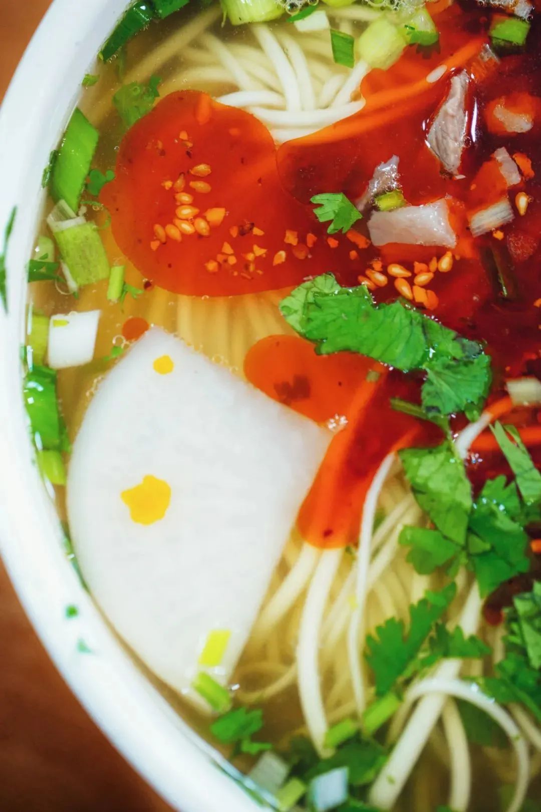 ▲一清(汤清)、二白(萝卜白)、三红(辣子油红)、四绿(香菜蒜苗绿)、五黄(面条亮黄),均在一碗面中。摄影/严肃 澎湃网