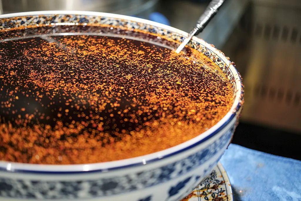 ▲青海牛肉拉面店里,汤锅旁边满满一大盆的油辣子是标配。(图片来源:视觉中国)