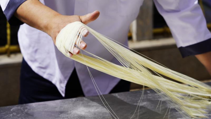 ▲拉面师傅精湛的拉面技艺。人民网 马可欣 摄
