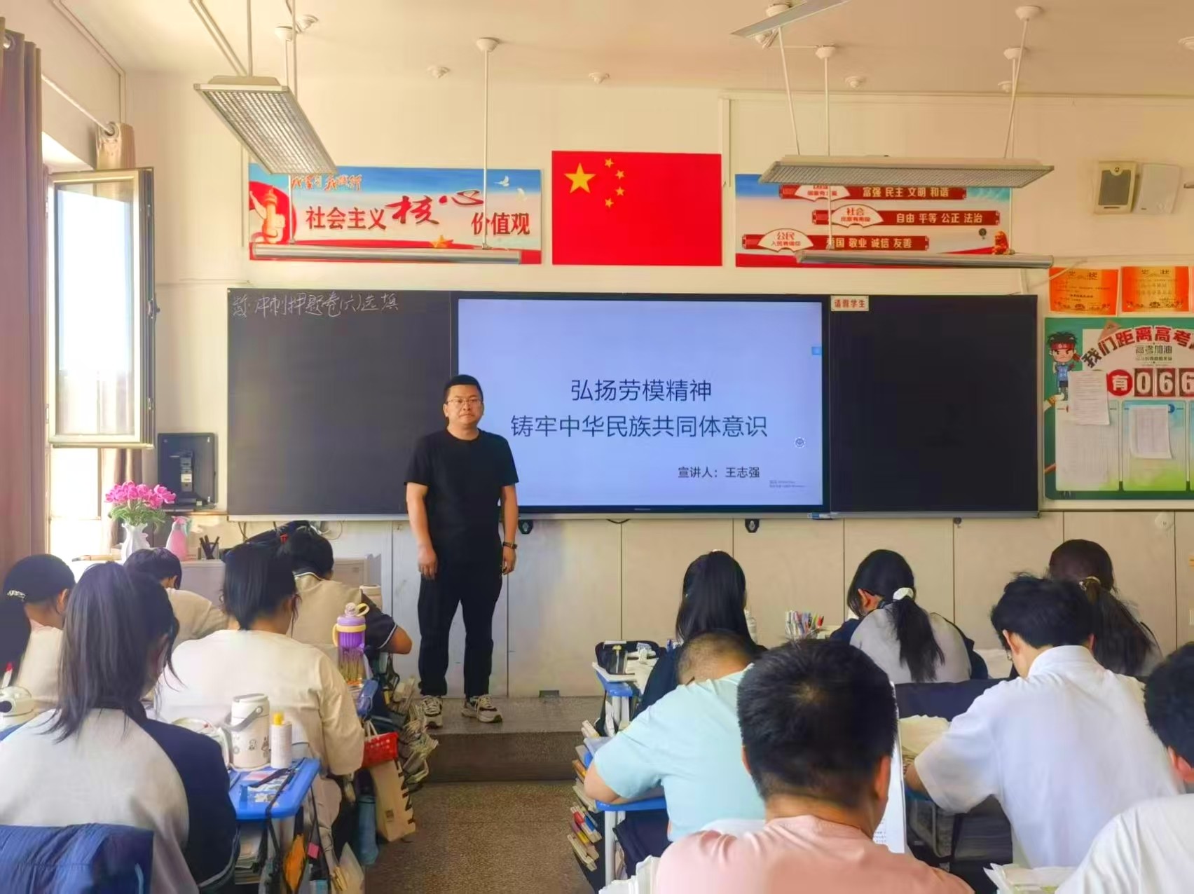 活动伊始,王老师结合自身从教经历,讲述他几十年奋战在教育一线的故事,宣讲中,王老师着重强调劳模精神与中华民族共同体意识的紧密联系,在中华民族大家庭中,各民族共同团结奋斗,共同创造辉煌。每一位劳动者都是民族团结进步的践行者,用辛勤劳动为国家繁荣、民族复兴添砖加瓦。他鼓励同学们树立正确民族观,弘扬劳模精神,努力学习科学文化知识,为实现中华民族伟大复兴贡献力量。