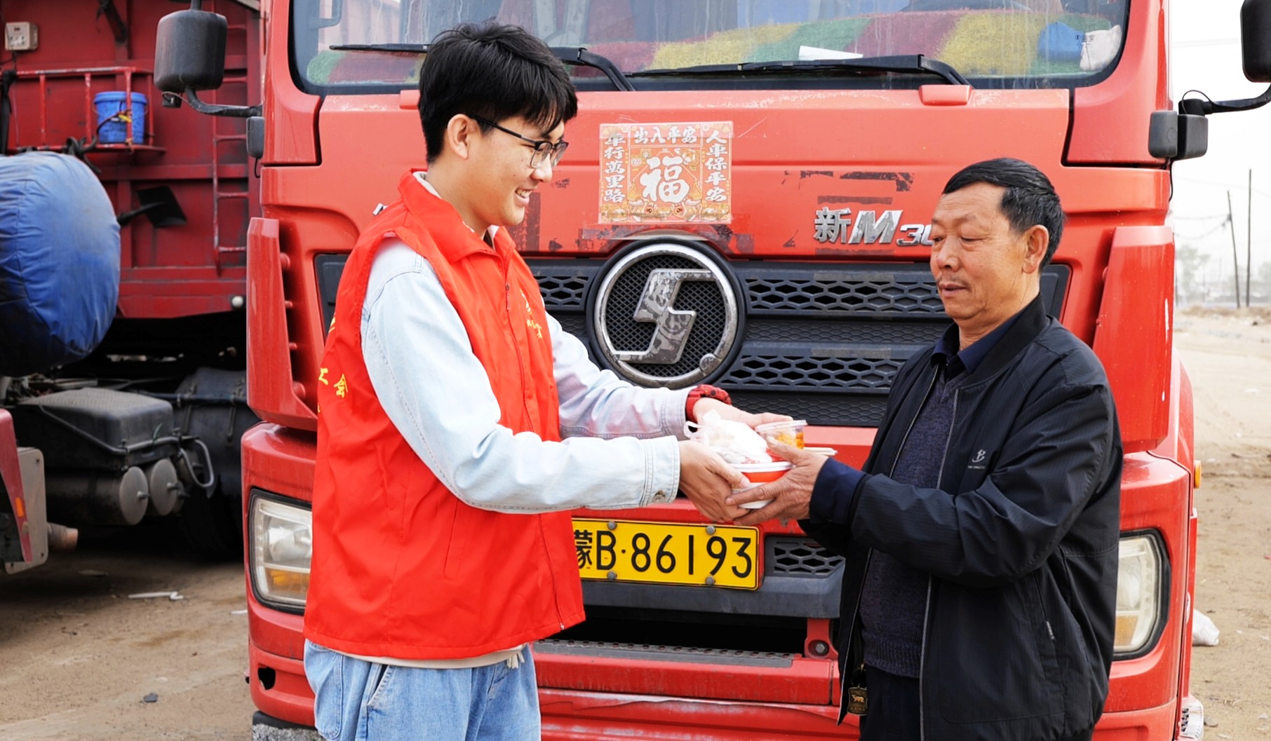 驿站门前,身着红马甲的工会工作者们穿梭如织。他们小心翼翼地将分装好的早餐递到劳动者皴裂的掌心,150份现做的肉饼搭配着热气腾腾的小米粥与秘制酱菜,每一份都凝结着“娘家人”的心意。司机师傅接过餐盒时不禁感叹:“这粥还烫手呢!”即将启程的货车司机、跺着脚驱寒的外卖骑手们捧着早餐,在朝霞初现的路沿围坐成温暖的圆圈。