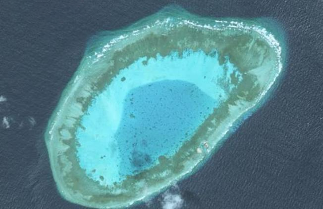 ▲簸箕礁,位于南沙群岛中南部,属于小型封闭型干出环礁(高分二号卫星影像)。(图片来源:央视网)