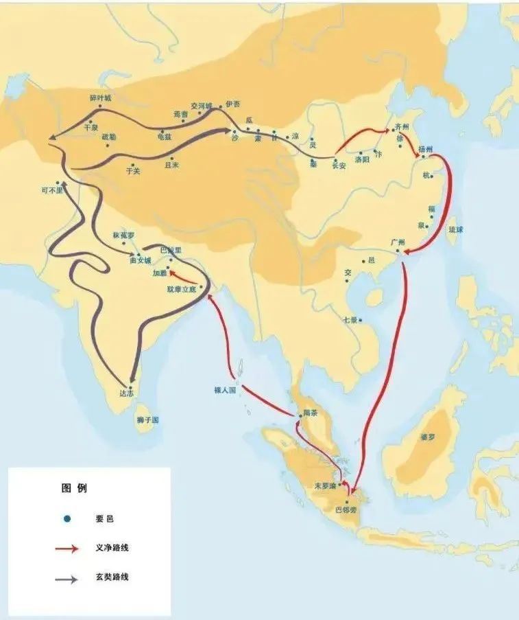 ▲义净路线与玄奘路线。(图片来源:济南宣传)