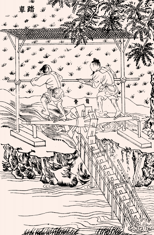 ▲《天工开物》插图——踏车。踏车是旧时依靠人力的一种引水机具。(图片来源:新京报)