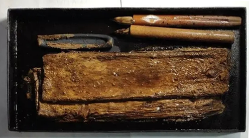 ▲慕容智(弘化公主第三子)墓出土的纸、墨、笔。(图片来源:文博中国公众号)