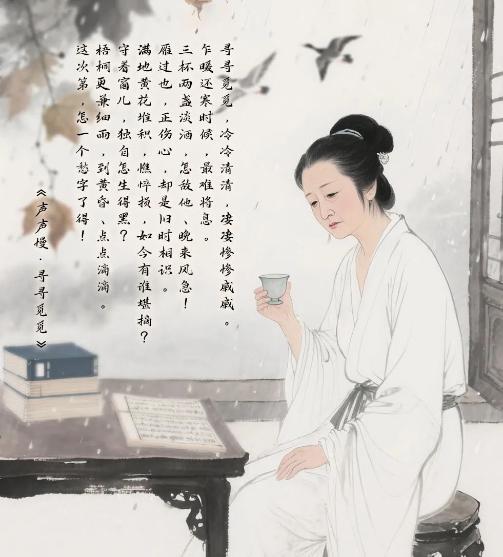 开篇十四叠字“寻寻觅觅,冷冷清清,凄凄惨惨戚戚”开宋词未有之境,将女性细腻的生命体验提升到哲学高度。