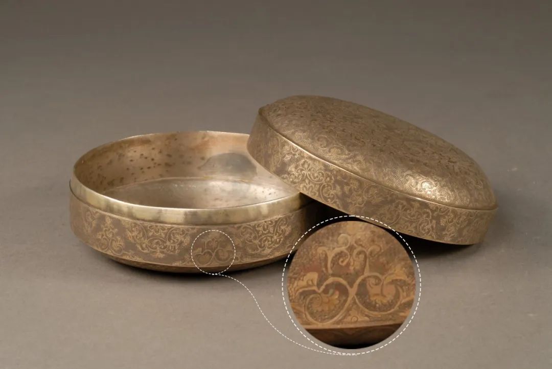 ▲唐代鎏金石榴花结纹银盒。(图片来源:陕西历史博物馆)