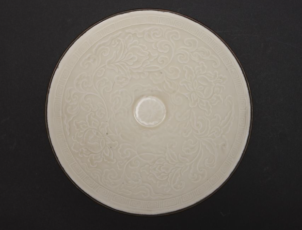 ▲北宋定窑白釉印花缠枝海石榴纹笠式碗,故宫博物院藏。