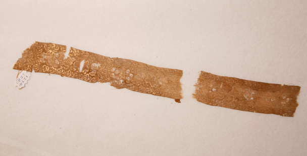 ▲元代绮地印金石榴纹襟缘。该织物残片为一绮地印金石榴纹襟缘。丝织物上用金,原出于对豪华富贵的追求。印金出现甚早,元代更是盛行。(图片来源:中国丝绸博物馆)