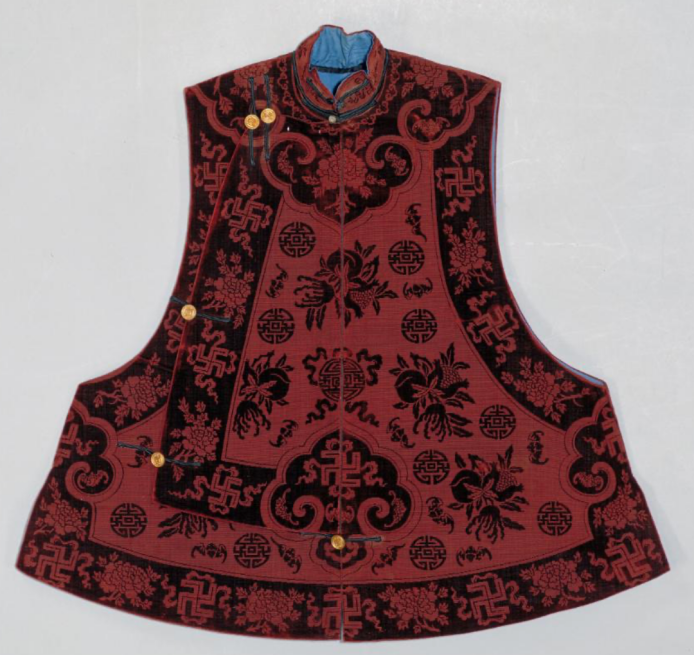▲清代紫色漳绒福寿三多纹袷坎肩,故宫博物院藏。