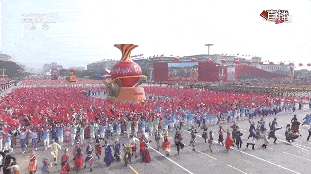 ▲2019年国庆群众游行中的“民族团结”方阵。花车采用石榴造型,寓意各民族像石榴籽一样紧紧抱在一起。(图片来源:人民日报)