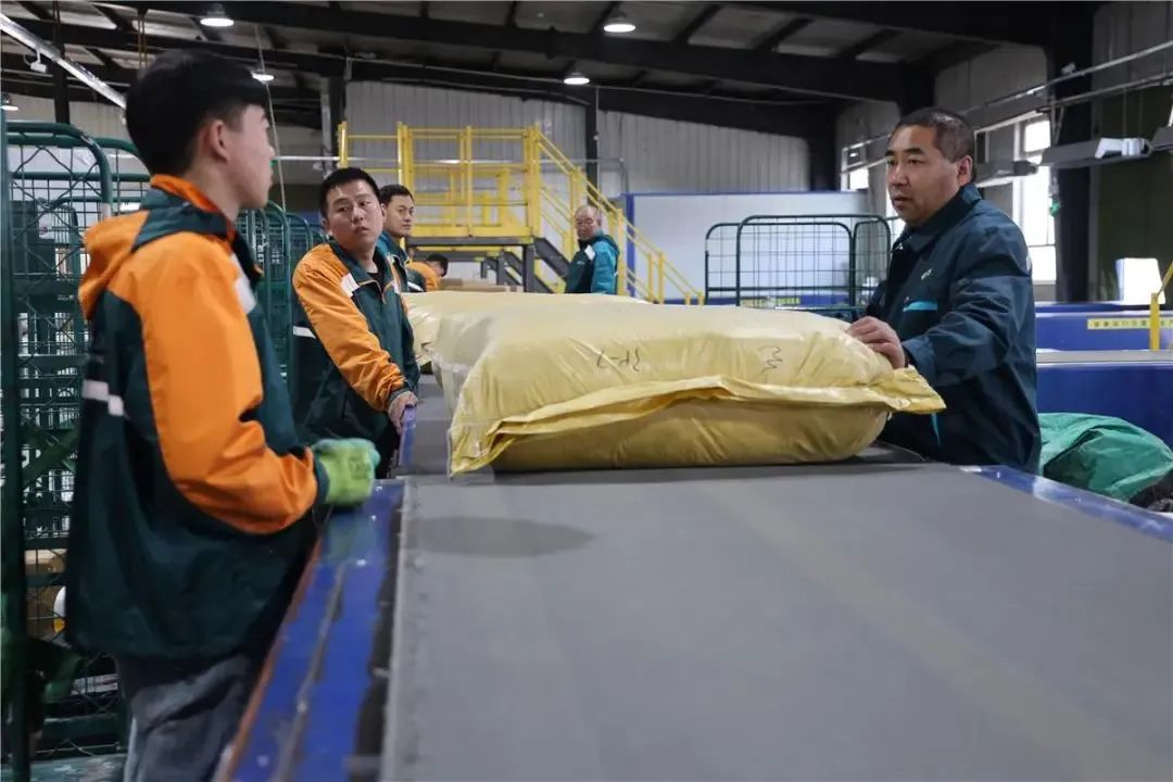 孟凡建(右一)和同事一起分拣异型邮件。(资料图)