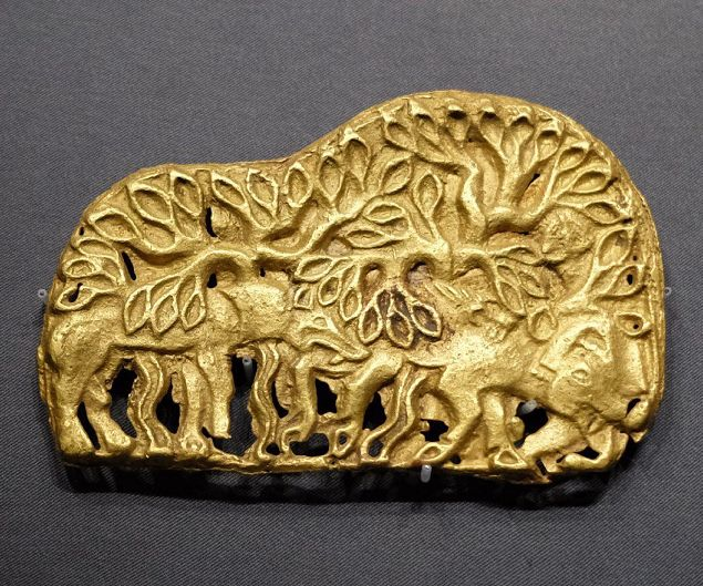 ▲出土于青海省海北州祁连县的“狼噬牛金牌饰”。静谧繁茂的树林、凶猛搏击的狼和牛,构成了一幅动静结合的生动画面。(图片来源:青海省博物馆)
