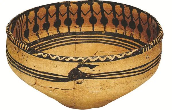 ▲青海省海南藏族自治州同德县宗日遗址出土的舞蹈纹彩陶盆,距今5000多年,生动描绘出一幅原始人群集体舞蹈的场景,与今天的“锅庄舞”相似。(图片来源:央视新闻)