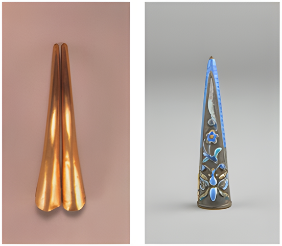 ▲左图:清代金指甲套。(图片来源:《清代服饰展览图录》);右图:清代珐琅银指甲套。(图片来源:南京博物院官网)
