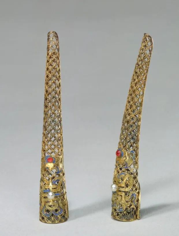 ▲清代银鎏金累丝嵌珠石指甲套,通体采用累丝工艺,并以点翠装饰蝙蝠图案和“寿”字图案。蝙蝠上嵌红色宝石一粒,“寿”字上镶珍珠一颗。制作细致,为清代后妃所用。(图片来源:故宫博物院)