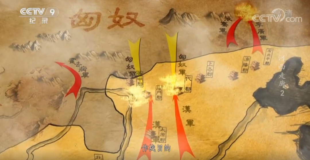 ▲公元前121年夏,汉军兵分多路进攻匈奴。(图片来源:纪录片《河西走廊》)