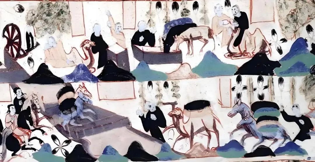 ▲敦煌莫高窟北周第296窟《福田经变》,描绘了丝绸之路上的往来商队。(图片来源:“敦煌研究院”微信公众号)