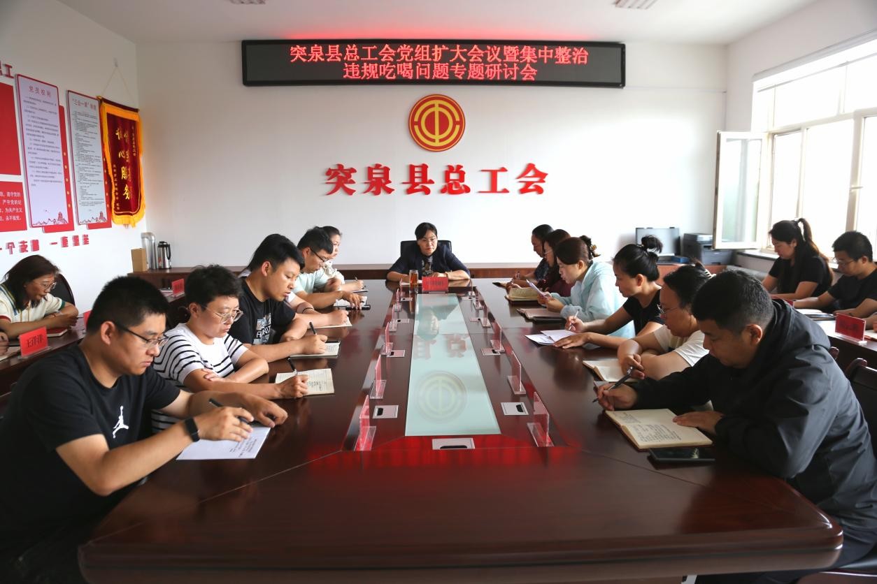 6月13日,突泉县总工会召开党组扩大会议暨集中整治违规吃喝问题专题研讨会。县总工会领导班子成员、各部室负责人、定岗在乡镇园区的社会化工会工作者及专职集体协商指导员全员参加了会议。